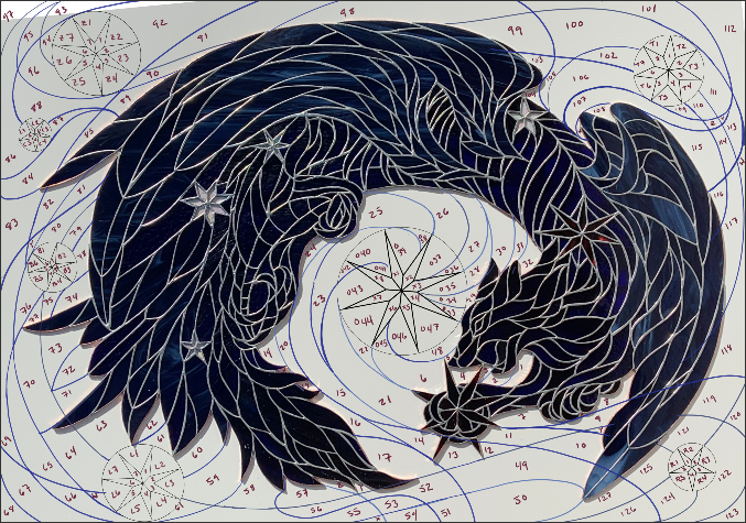 After nearly a year of work (not full-time, usually in the evenings after I finished painting for the day), my Great Celestial Beast was complete! Most of the body was made out of a gorgeous deep blue, violet, and burgundy wispy glass made by Wissmach, with the wings a deep blue and white/opal wispy (Oceanside, I think?), with a few other odd panes added in as contrast.